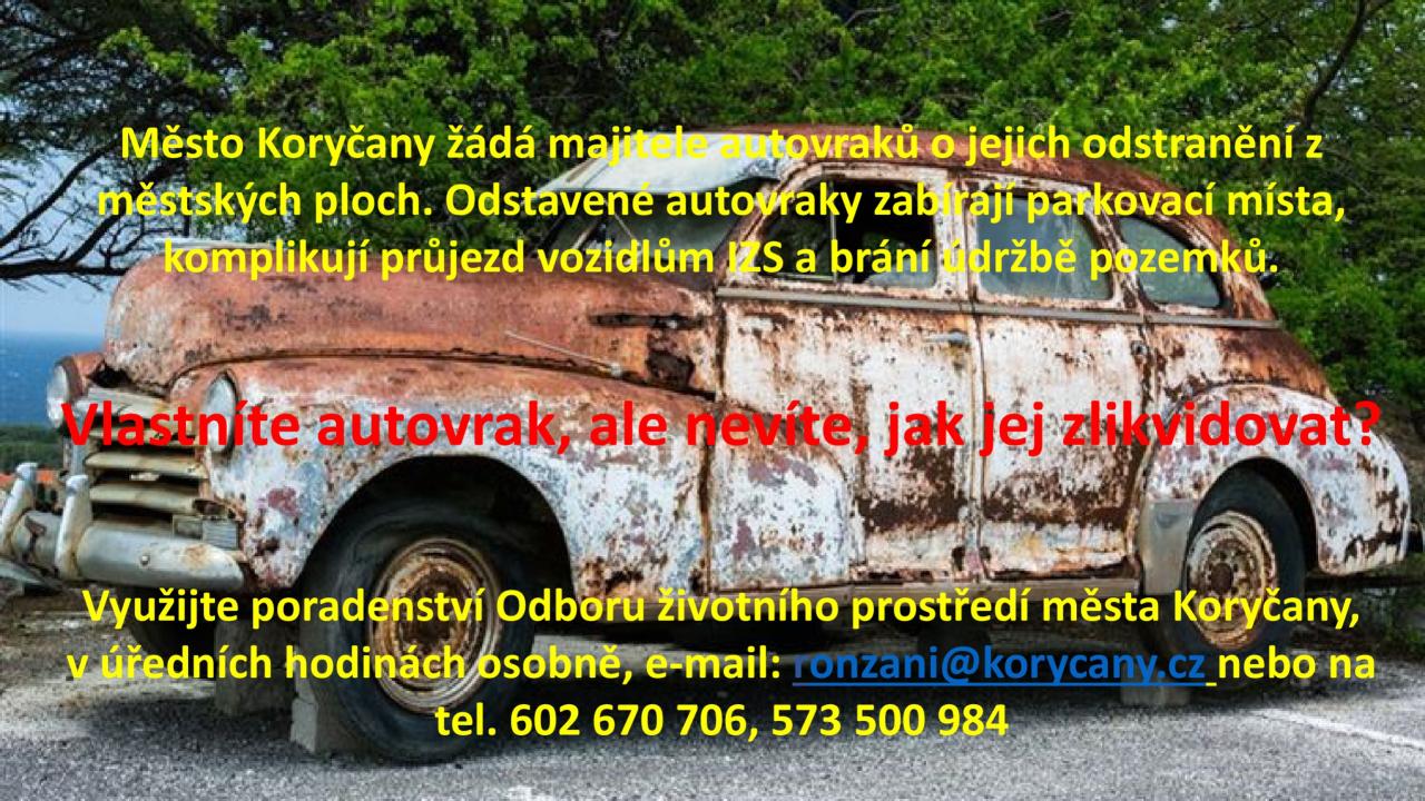 Město Koryčany žádá majitele autovraků o jejich odstranění z městských ploch. Odstavené autovraky zabírají parkovací místa, komplikují průjezd vozidlům IZS a brání údržbě pozemků.