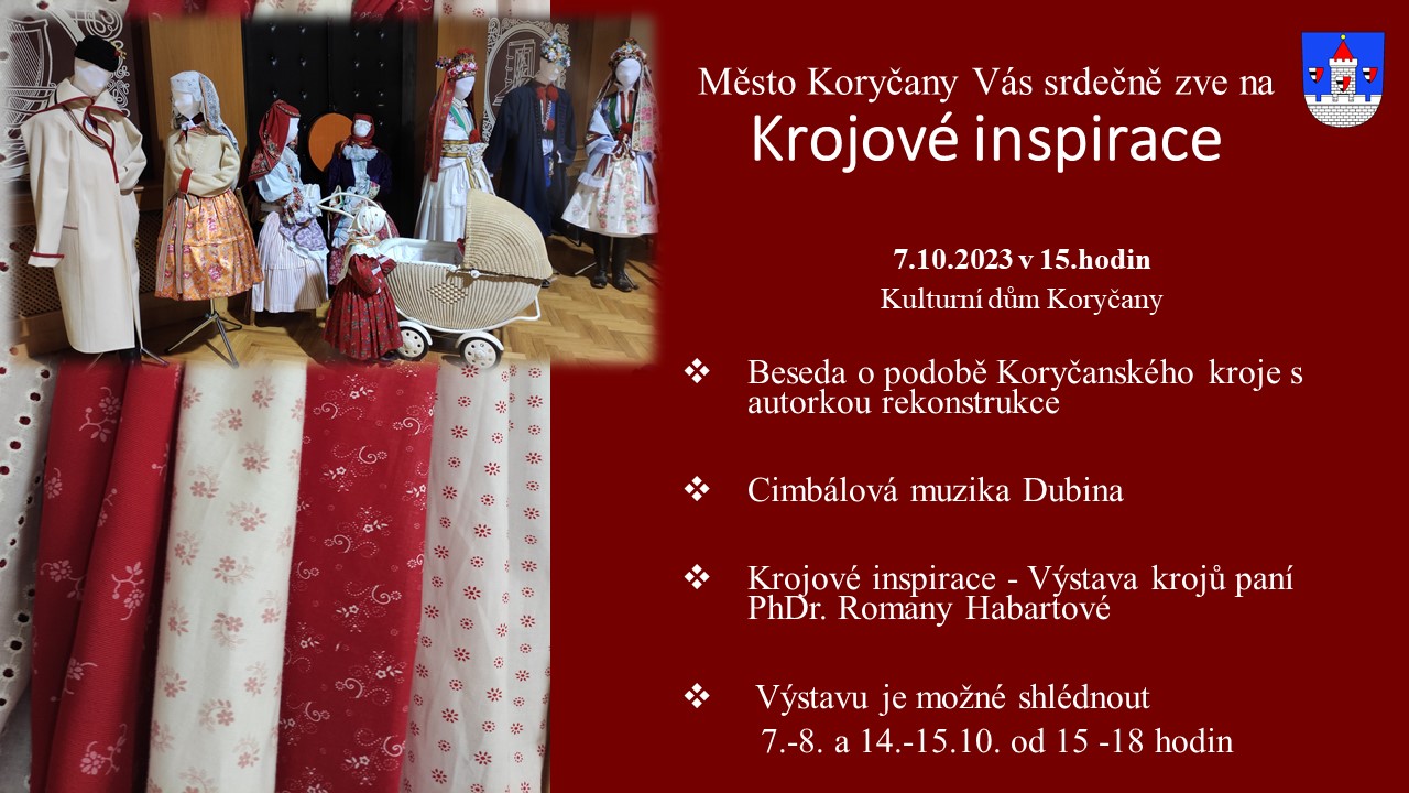 V sobotu 7. 10. 2023 odpoledne se sešlo na 120 návštěvníků v KD Koryčany, aby si prohlédli výstavu krojů, poslechli přednášku PhDr. Romany Habartové o rekonstrukci koryčanského kroje a zaposlouchali se do cimbálové muziky uskupení Dubina.