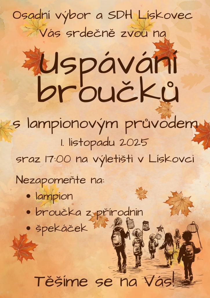 Osadní výbor a SDH Lískovec zvou všechny děti a rodiče na již tradiční uspáváním broučků s lampionovým průvodem, který se koná na výletišti v Lískovci. Přijďte si užít večer plný radosti, světel a krásných lampionů. Těšíme se na vaši účast a společné prožití nezapomenutelného večera!